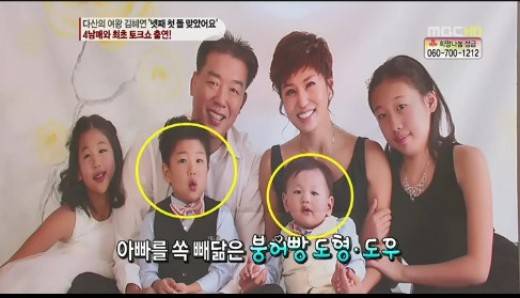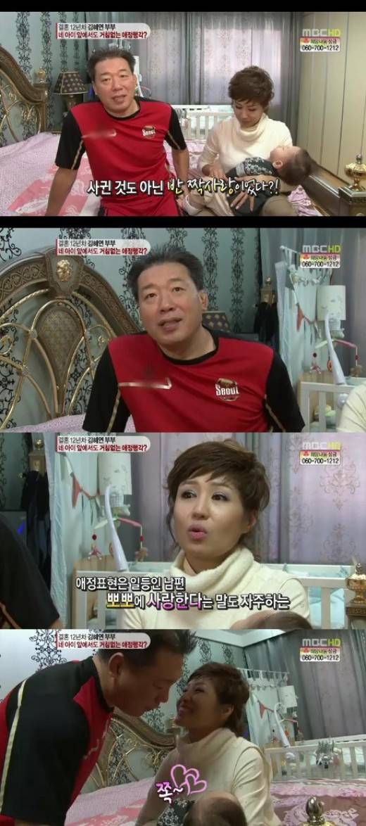 김혜연의 남편은 카메라 앞에서 보여달라고 하니까 부끄러워하다가 아내와 넷째의 볼에 가볍게 뽀뽀를 했다.