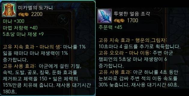 마지막으로 마나 +300, 마법 저항력 +40과 함께 아군 챔피언에게 각종 해로운 효과를 제거하고 잃은 체력의 15%만큼 회복시켜 주는 '미카엘의 도가니', 10초마다 4골드를 획득하며, 아군 하나를 감싸 주변 적의 이동속도를 30% 늦출 수 있는 '투명한 얼음 조각' 등의 아이템도 함께 게이머들 앞에 모습을 드러냈다.