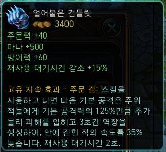 마나 +425, 방어력 +45, 스킬 재사용 대기시간 감소 15% 등의 특성을 지니고 있는 '빙하의 장막'과 마나 +250, 주문력 +25 등의 효과가 있는 광휘의 검을 조합해 만들 수 있는 얼어붙은 건틀릿은 방어력과 주문력을 동시에 올려주는 아이템이다.