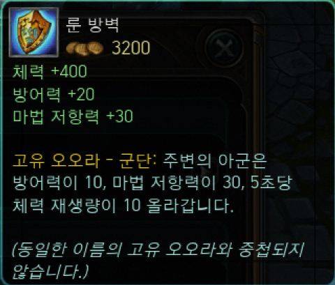 방어 혹은 서포트 챔피언을 플레이 하는 게이머들의 필수 아이템 '군단의 방패'의 상위 버전 '룬 방벽'이 등장했다. '룬 방벽'은 '군단의 방패'에 마법무효화의 망토를 추가한 아이템으로 체력 200, 마법 저항력 10이 증가한 것이 특징이다.