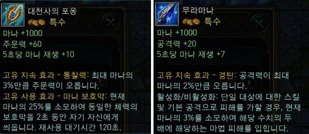 '대천사의 포옹'과 '무라마나' 아이템은 매우 독특한 방식으로 만들어진다. 스킬을 사용할 때마다 마나가 증가하는 '여신의 눈물'을 통해 만들 수 있는 두 아이템은 '여신의 눈물'을 사용해 증가한 마나 수치가 1,000이 넘을 경우 따로 구입할 필요 없이 자동으로 생성된다.