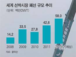 14일 영국의 조선ㆍ해운 분석기관 클락슨에 따르면 올 들어 지난달까지 누적 선박 해체량은 5,230만DWT에 달하는 것으로 나타났다. 이런 추세가 이어지면 연간 폐선 규모는 5,800만DWT를 이를 것으로 조사돼 지난해 기록한 최고치(4,260만DWT)를 가볍게 제칠 전망이다. 폐선물량은 조선 경기가 한창이던 2008년만 해도 1,420만DWT에 불과했으나 4년 새 4배나 폭증했다.