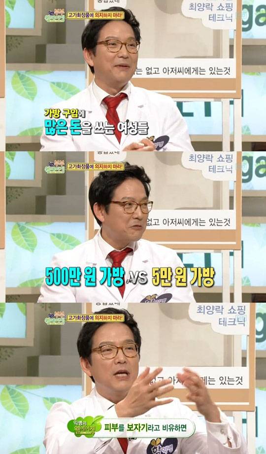 그러자 함익병은 "여자들이 가장 사치하는 것이 가방이죠? 5만원짜리 가방이나 500만원짜리 가방이나 지갑을 넣는다고 이자가 늘어나지 않는다"라며 "가방이나 화장품이나 별 차이가 없다. 하지만 자외선 차단제와 보습제를 열심히 바르면 5년, 10년 지나면 차이가 난다"고 전했다.