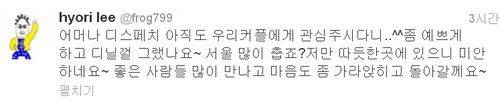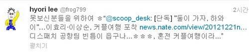 이효리는 21일 자신의 트위터에 '어머나. 아직도 우리 커플에게 관심을 주시다니^^ 좀 예쁘게하고 다닐 걸 그랬나요~? 서울 많이 춥죠? 저만 따뜻한 곳에 있으니 미안하네요~. 좋은 사람들 많이 만나고 마음도 좀 가라앉히고 돌아갈게요'라는 글을 올렸다. 이어 자신이 이상순과 동반 출국하는 모습을 찍어 보도한 언론사 기사 링크를 올리며 '이 매체 공항팀 빈틈이 없구나. 혼전 커플여행이라. 하하하'라고 언급했다.