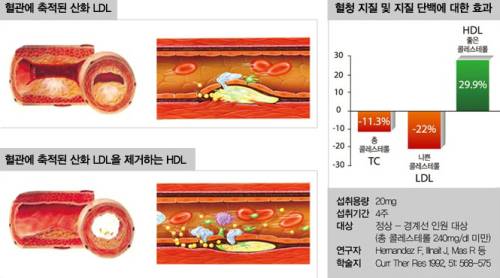 몸에 좋은 콜레스테롤인 'HDL'의 수치는 올리고 나쁜 콜레스테롤인 'LDL'은 내리는 방식이다. 이미 1991년부터 10여년에 걸친 인체시험을 통해 안전성과 기능성이 증명된 바 있으며, 한국을 비롯 미국·일본·호주 등 30여개 국에서 특허를 획득한 믿을 수 있는 개별인정형 원료이다. 국내에서는 보령제약그룹이 건강기능식품으로 출시하였으며, 이미 10만명이 넘는 소비자들이 선택하여 그 효능을 인정받고 있다.
