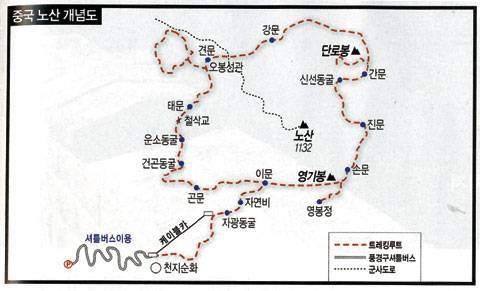 더 오르면 이문(離門)이 나타난다. 여기서 길이 나뉜다. 오른편은 영기봉 가는 길이고, 왼쪽은 곤문(坤門)으로 이어진다. 여기가 노산 거봉 둘레를 한 바퀴 도는 팔괘의 기점이다. 노산은 도교의 본산으로 중국에서 유명하다.