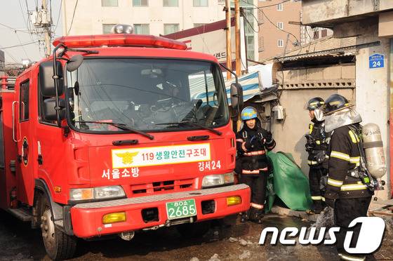 강서소방서는 11일 공항시장 및 신월중앙시장에서 겨울철 화재진압을 위한 소방통로 확보와 비상시에 활용할 수 있는 비상소화장치를 활용한 화재진압 훈련을 실시했다. (강서소방서 제공) 2013.1.11/뉴스1