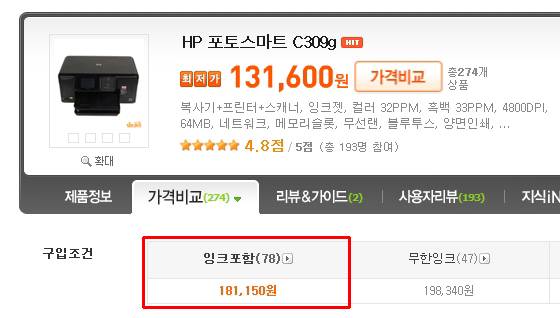 현재 C309g의 인터넷 최저가는(잉크 포함)약 18만 원대. 성능에 비해서 저렴하다는 생각이 들었지만, 잉크젯 프린터는 원래 본체 가격이 저렴하고 잉크 비용이 비싸기로 유명하니 그럴 수도 있겠다 싶다.