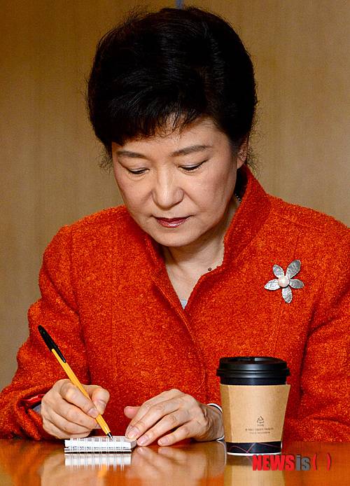 【서울=뉴시스】김영욱 기자 = 박근혜 대통령 당선인이 16일 오후 성동구 CGV왕십리에서 열린 '박근혜 대통령 당선인과 함께하는 애니메이션 산학리더 간담회'에서 참석자들의 의견을 메모하고 있다.