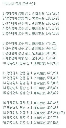 이에 따르면 1위는 김해 김씨가 차지했으며 밀양 박씨, 전주 이씨, 경주 김씨, 경주 이씨가 상위권에 이름을 올렸다. 인원수가 100만 명이 넘는 상위권은 김, 이, 박씨가 차지하고 있다.