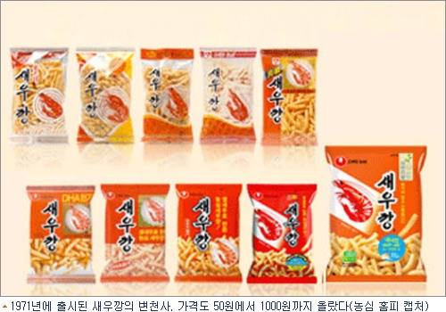 1971년 권장소비자가 50원에 출시된 스낵과자의 대명사 '새우깡'의 몸값 상승은 더욱 가팔랐다. 20년 전 200원이던 새우깡은 3~4년을 주기로 100원 씩 가격이 오르더니 2008년 2월 800원, 2011년 8월 900원에서 지난해 8월 급기야 1,000원으로 상승했다. 이젠 동전이 아닌 지폐를 가져가야 과자 한 봉지라도 겨우 사먹을 수 있는 시대가 온 것이다.