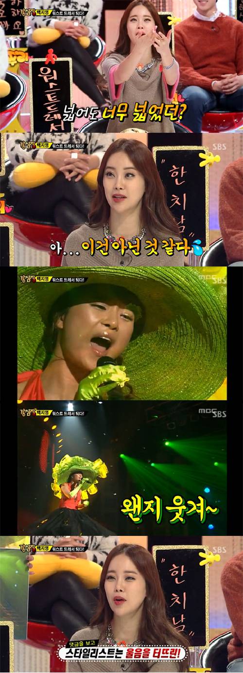 22일 밤 방송된 SBS '강심장'에는 백지영이 출연해 워스트 드레서로 꼽혀 화제가 됐던 의상에 얽힌 웃지못할 비화를 공개했다.