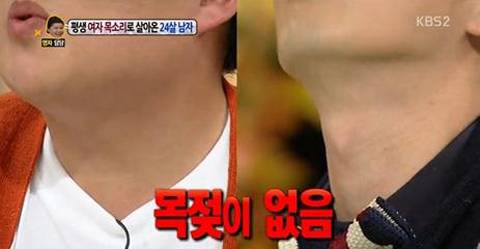 지난 21일 방송된 KBS2 '대국민 토크쇼 안녕하세요'에는 목젖이 없는 남성이 출연해 화제가 됐다. 이 남성은 "목소리를 바꿔보기 위해 과도한 음주도 시도해봤으나 그럴수록 목소리가 점점 더 여성스러워졌다"고 고충을 털어놨다. 이 남성의 고민을 해결할 수 있는 방법이 있을까?
