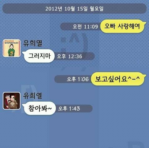 사진에는 박지선이 유희열에게 보낸 카카오톡 대화가 캡처되어 있다. 먼저 박지선이 "오빠 사랑해요"라며 애정을 드러내자 유희열은 "그러지마"라며 시크하게 반응해 웃음을 자아냈다.