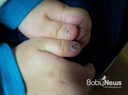 사진 속 아기의 엄지 손톱에는 네임펜으로 눈, 코, 입이 그려진 웃는 표정의 그림이 낙서돼 있었다.