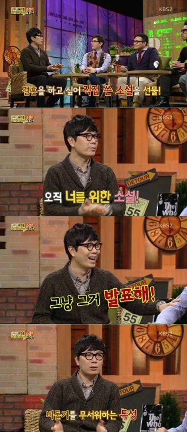이날 김영하는 "아내와 꼭 결혼을 하고 싶어서 아내를 위한 소설을 썼다. 그리고 '발표하지 않겠다. 너 하나만을 위해 쓴 소설이다'고 말했다"고 아내만을 위한 소설에 대해 이야기했다.
