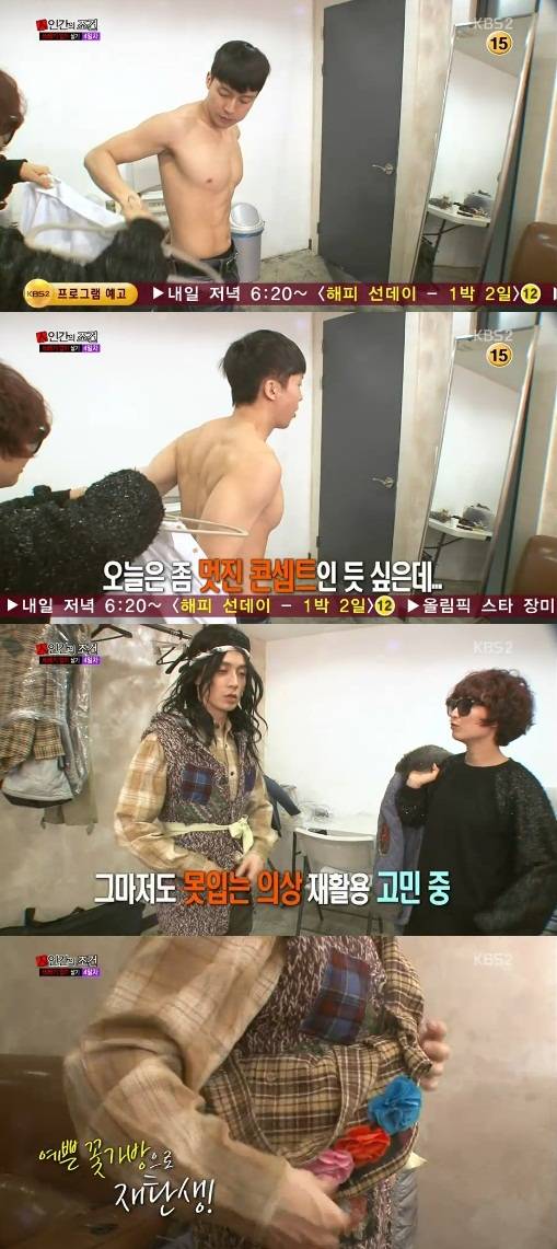 또 이날 허경환은 자신이 입던 의상을 이용해 '꽃거지 가방'도 완성해 눈길을 끌었다. (사진=KBS 2TV '인간의 조건' 캡처)