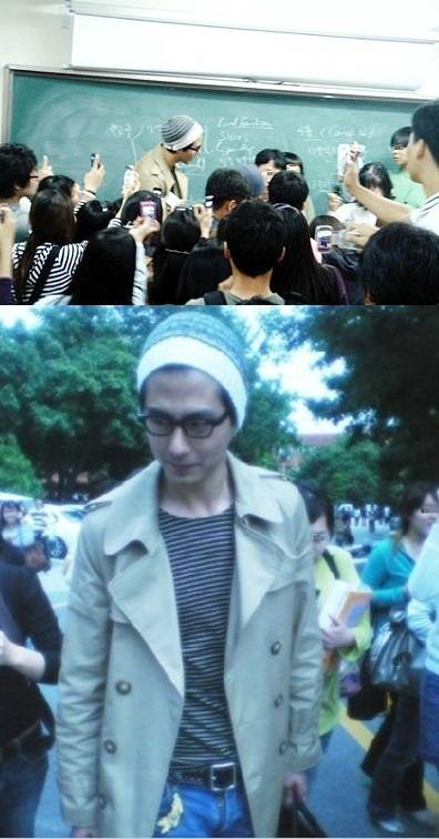 줄무늬 비니와 검정 뿔테로 멋을 낸 조인성은 자유롭게 교정을 거닐기도 하는 모습이다. 특히 조인성은 혼자서만 높은 곳에 올라가 있는 것 마냥 큰 키를 자랑해 눈길을 끌었다.