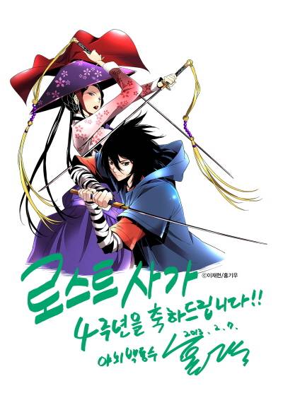 < 로스트사가 4주년 기념 축전을 보낸 야뇌백동수의 이재헌, 홍기우 >조이맥스의 자회사 아이오엔터테인먼트(대표 박종하)가 개발하고 위메이드엔터테인먼트에서 서비스 하는 대전 액션 온라인 게임 '로스트사가'에서 서비스 4주년 맞이 이벤트가 진행된다.