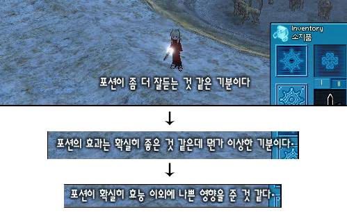 < 포션 부작용을 잘 표현한 마비노기 >포션에 의존해 게임을 하면 중독 현상을 보이는 경우도 있다. '마비노기'에서는 포션을 계속 사용하게 되면 '포션이 잘 드는 것 같다'는 메시지가 표시된다.