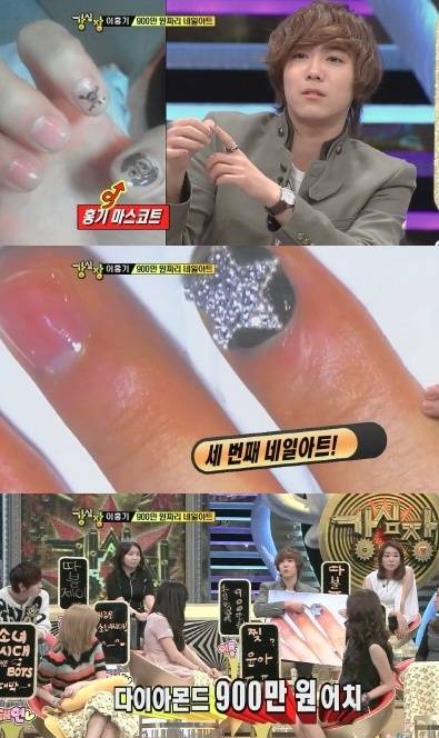 이날 방송에서 이홍기는 900만원짜리 네일아트를 공개해 스튜디오를 술렁이게 했다. 별 모양의 손톱 장식은 다이아몬드였던 것.