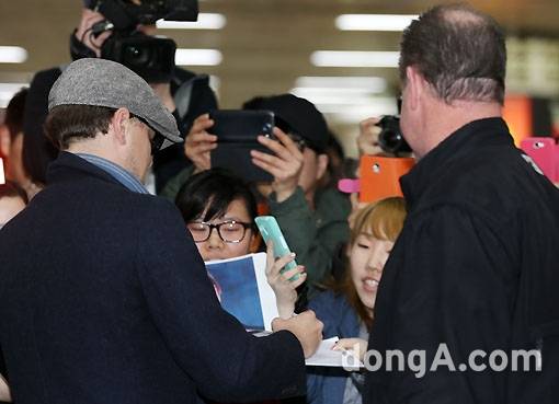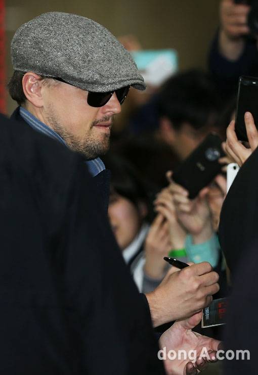 그의 모습이 보이자 한국팬들은 일제히 "Leo!(레오)"를 외치며 감격에 겨운 비명을 질렀다. 그는 손을 들어 화답을 한 뒤 자신을 기다린 팬들을 위해 잠깐의 인사와 사인요청에 응한 후 빠르게 공항을 빠져나갔다. 한국팬들은 디캐프리오와의 짧은 만남을 아쉬워했다. 일부 팬들은 그에게 받은 짧막한 사인에도 감격했다.