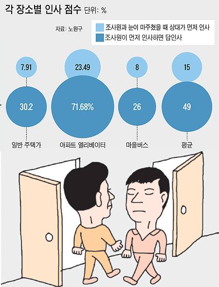조사 결과, 노원구 주택가, 아파트 엘리베이터, 마을버스에서 조사원과 인사를 한 주민은 100명 중 32명꼴(32.4%)이었다. 세 명 중 한 명만 인사를 나눈 꼴이었다.