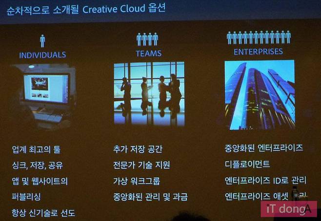 그리고 이날 발표된 어도비 크리에이티브 클라우드는 중소기업을 위한 팀(Team)버전이다. 향후 개인용(Individuals)과 대기업용(Enterprise)버전도 출시 예정이라고 한다. 팀 버전의 사용료는 1년 약정 기준으로 매월 약 11만 2,000원(VAT 별도)이다.