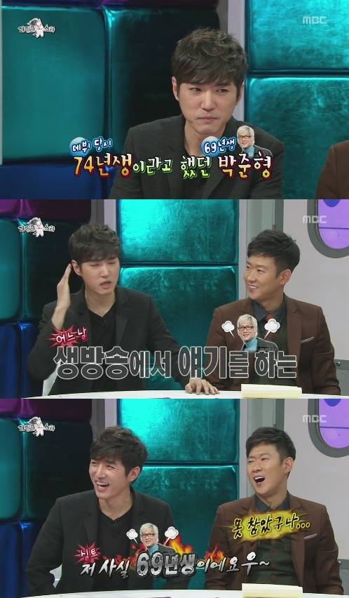 이어 "준이 형이 처음에는 74년생이라고 했다. 당시 대표님이 시켰다"며 "74년생으로 데뷔해 활동하는데 방송국 PD 분들이 사실 형보다 어린데 반말을 했다. 그걸 자기가 못 견뎠다. 어느날은 생방송에서 '저 사실 69년생이에요'라고 얘기했다"고 박준형의 폭탄발언을 폭로했다. (사진=MBC '라디오스타' 캡처)