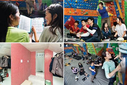 ↑ [월간산]1 신규 회원 10명 중 7명이 젊은 여성이라고 한다. 2 젊은 20대의 열기로 가득한 암장. 3 여성 회원들을 배려해 탈의실을 깔끔하게 했다. 4 애스트로맨 암장은 홍대부근에 위치하고 있어 젊은 층이 많이 찾는다. |