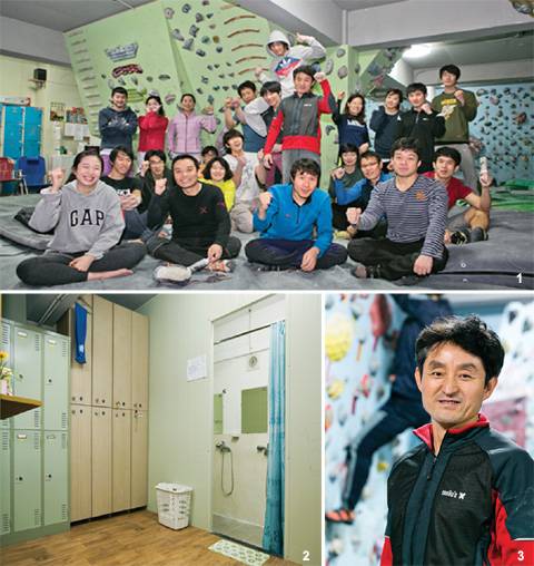 ↑ [월간산]1 20~30대 젊은 회원들이 주를 이룬 조규복암장. 2 비교적 넓고 깔끔한 편의시설을 갖추었다. 3 볼더링 스타일을 강조하는 조규복 센터장. |