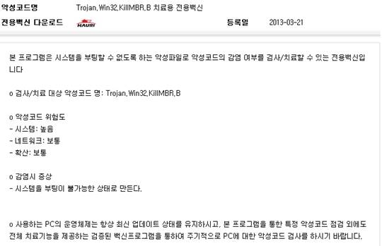방송통신위원회와 한국인터넷진흥원(KISA)은 20일 발생한 일부 방송사 및 금융사의 내부 전산망 마비 관련 악성코드를 탐지 및 치료할 수 있는 전용백신을 개발해 보급했다고 21일 밝혔다.