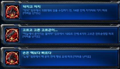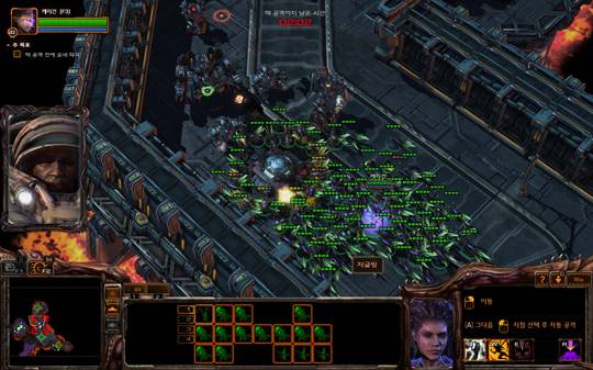 마지막 '노병'에서 달성할 수 있는 '손은 핵보다 빠르다' 업적은 초반 캐리건에게 주어지는 저글링과 맹독충 병력 충원으로 가운데 위치한 행성 요새를 파괴 하는 것이다.