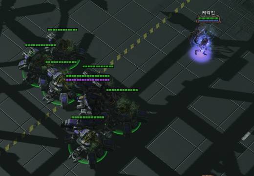 두번째 방법은 울트라리스크+캐리건의 파멸 기술로 돌파하는 것인데 울트라리스크의 군단 업그레이드 토라스크는 필수다. 레이너가 진출할 때 시계 방향으로 조금씩 들어가 오딘이 진출하기 직전, 입구에서 대기하고 있는 것을 잡아내면 된다.