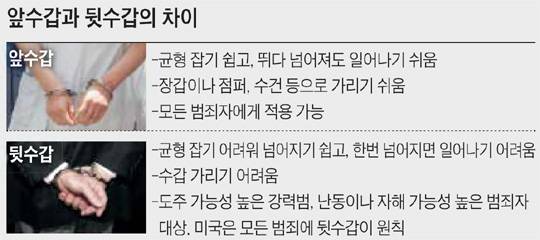 경찰은 어느 경우에 반드시 뒷수갑을 채워야 한다고 규정한 매뉴얼이 없는 데다 인권 침해 진정 사례가 늘어나고 있어 웬만하면 앞수갑을 채우고 있다. 너무 탄탄하게 채우는 것도 시빗거리가 돼 부담스러워한다. 범죄자들은 이런 '빈틈'을 파고들고 있다. 지난해 수갑을 풀고 달아난 '자매 성폭행범' 노영대도 앞수갑을 헐겁게 채운 상태였다.