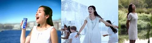 포카리스웨트하면 포카리송과 함께 가장 먼저 떠오르는 화이트 원피스. 세 모델 모두 청순한 스타일로 소화했지만, 각기 다른 분위기가 느껴지는 것이 재미있다. 한지민은 군더더기없이 심플한 디자인으로 깨끗한 느낌을 강조한데 비해 김소은은 펀칭 디테일과 이국적인 목걸이, 뱅글로 좀 더 로맨틱한 룩을 만들었다. 2013년 새 모델로 발탁된 박세영은 색다르게 바다가 아닌 숲을 배경으로 레이스 원피스를 입어 차분한 여성스러움을 강조한 것이 눈에 띈다.