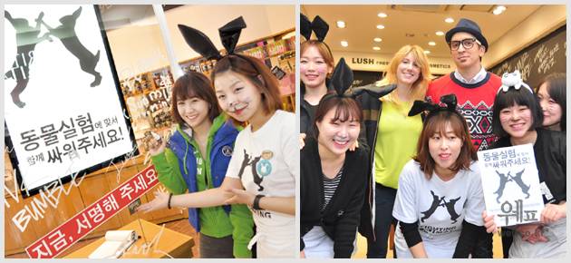 영국 핸드메이드 코스메틱 브랜드 러쉬는 지난 3월 11일부터 22일까지 전국 러쉬 매장과 동물보호 시민단체 카라(KARA)와 함께 국내 화장품 동물실험 금지법 제정을 촉구하는 서명운동을 진행하며 동물실험 반대에 앞장 섰다.