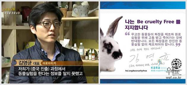 '아로마티카'를 제조, 유통하고 있는 '㈜에코플래닛'의 '김영균' 대표는 "우리와 똑같은 생명을 가진 무고한 동물들이 화장품 제조와 원료 실험을 위해 고통 받는 것에 대해 반대하며, 아로마티카 역시 소비자들에게 진정성있는 유기농 화장품을 제공하려고 노력하는 만큼, 윤리적이지 않은 동물실험에 반대하기 위해 할 수 있는 범위 내에서 최선을 다할 것."이라고 전했다.