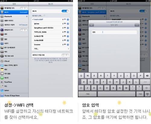 태블릿과 연결 태블릿에서 테더링을 이용한 인터넷 사용 또한 간단하다. 집과 회사에서 와이파이 연결하듯 테더링으로 표시된 네트워크를 찾아 암호를 입력하는 것으로 끝이다. 여기서는 아이패드 연결 과정을 소개하지만 안드로이드 기반 태블릿 또한 이처럼 와이파이 연결 과정을 따라 진행하면 된다.