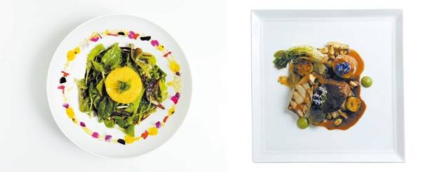 (좌)줄리앙·패랭이·소국·미니장미 등 식용 꽃을 넣어 완성한 디너 샐러드. (우) 해산물로 만든 그라탕과 등심 스테이크 위에 세이지를 올려 장식했다.