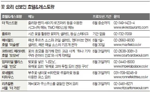 봄에 나는 꽃을 활용한 요리는 식욕을 돋우는 데 그만이다. 은은한 꽃 향기와 음식 냄새가 조화를 이루며 행복한 식탁을 완성해준다. 따스한 햇살아래 핀 봄꽃은 겨우내 에너지를 듬뿍 담고 있어 맛과 향은 물론 영양까지 풍부해 계절 식재료로 즐겨 사용된다. 최근 다양한 꽃의 효능이 부각되면서 요리에서 꽃을 더욱 자주 볼 수 있게 됐다. 국내에서 구할 수 있는 식용 꽃 종류는 700~900여 가지가 넘는다. 요즘 활용할 수 있는 식용 꽃은 진달래·벚꽃·매화·국화·동백·카네이션·펜지·금호초·세이지·배고니아·줄리앙·장미 등이 있다.