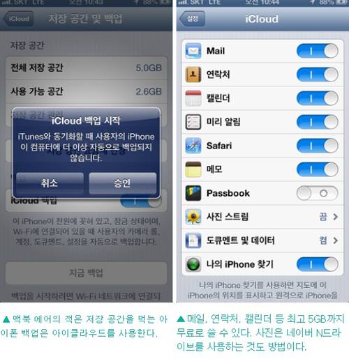 7. 아이폰 백업 대상 '아이클라우드'로 결정 맥북 에어를 선택한 사용자 대부분은 아이폰을 사용할 것으로 생각한다. 아이폰에 빠져 PC를 맥으로 바꿨다는 얘기를 자주 듣는다. 실제 응용 프로그램간 연계 등 쓰기에서 윈도우 컴퓨터를 앞서기도 한다. 그렇지만 잘 생각해보면 맥북 에어의 저장 공간은 SSD이므로 그리 넉넉치 않다. 11인치 모델을 예로 들면 64GB와 128GB 2가지 모델 선택이 가능하고 공장 출시 시점에서 OS 등 시스템이 약 20GB를 사용한다. 아이폰 애플리케이션 및 사진/동영상이 늘어나면 백업 파일은 순식간에 GB 단위가 되니 소중한 맥북 에어의 저장 공간을 점유해버린다. 집에 다른 컴퓨터가 없는 경우 아이폰 백업 대상은 아이클라우드로 해두는 것이 좋다. 무료로 최대 5GB를 사용할 수 있기 때문에 헤비 유저가 아닌 한 추가 비용은 발생하지 않는다.