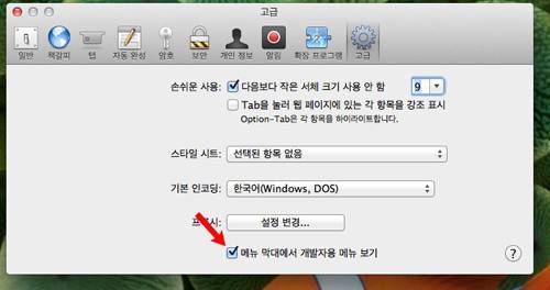 ▲ 사파리는 메뉴에서 '환경설정- > 고급'에서 '메뉴 막대에서 개발자용 메뉴 보기'를 선택한다.