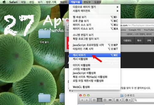 ▲ 사파리에 '개발자용' 메뉴가 추가됐다. 캐시 비우기를 선택하면 용량을 늘릴 수 있다.