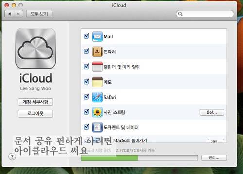 2. 어디서나 문서 공유되는 '아이클라우드' 아이폰 또는 아이패드를 사용하는 경우 아이클라우드는 꽤나 유용하다. 시스템 환경 설정의 'iCloud' 패널에서 동일한 계정(애플ID로 등록한 이메일)을 등록하면 사용 준비 끝이다. 기본 설정을 변경하지 않으면 캘린더와 연락처 정보가 자동으로 동기화된다. 아이클라우드는 '사진 스트림'이라는 강력한 사진 자동 전송 기능이 포함되어 있다. 아이폰/아이패드가 무선 랜과 연결되는 타이밍에 맞춰 카메라 롤에 추가된 사진이 아이클라우드에 자동 전송되고 이 사진은 맥북 에어에 설치된 이미지 뷰어 아이포트 또는 어퍼쳐에서 감상할 수 있다. 케이블 연결이 필요 없기에 아이폰에서 촬영한 사진을 맥북 에어에서 보기 위한 가장 좋은 방법이 아닐까 싶다.