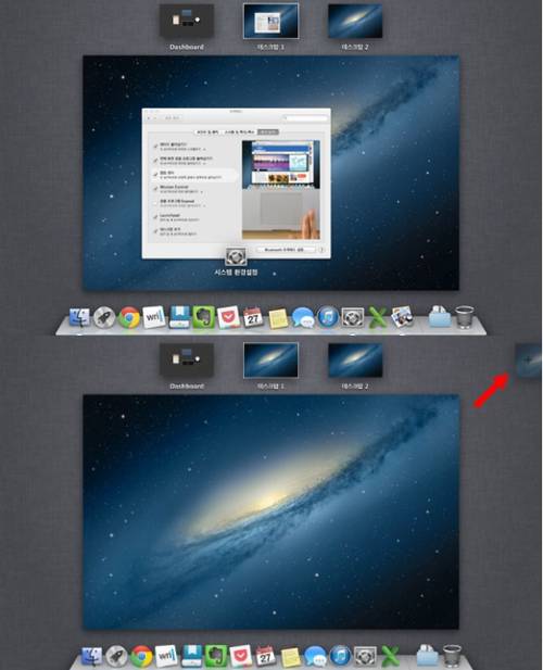 3. 전체 화면 활용 맥북 에어 11인치 모델은 1.08Kg이라는 가벼움이 매력이지만 화면 해상도는 1366X768로 여러 프로그램을 띄어놓기에는 다소 작은 느낌이다. 그러나 실행 중인 프로그램을 전체 화면으로 전환, 관리할 수 있는 '(미션 컨트롤) Mission Control'을 이용하면 깔끔한 화면에서의 작업이 가능해진다. 전체 화면의 화면간 전환은 책장 넘기듯 트랙 패드 위에 세 손가락을 올려놓고 좌우로 슬쩍 움직이는 것으로 그만이다. 바탕화면(데스크탑)을 여러 개 만들 수 있는 것도 미션 컨트롤의 백미. 트랙 패드에 세 손가락을 놓고 화면 위로 슬쩍 밀어보자. 그러면 미션 컨트롤 관리 화면이 나오고 여기서 마우스 커서를 화면 맨 오른쪽으로 이동하면 새로운 바탕화면을 만들 수 있다. 데스크탑 1, 데스크탑 2 식으로 이름이 붙여진다.