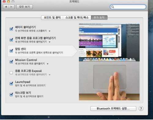 1. 트랙패드 마스터 맥북 에어를 구입하고 가장 먼저 익숙해져야 할 것이 트랙 패드다. 맥북 에어가 쓰는 운영체제 'OS X 마운틴 라이언'은 일반 마우스도 지원하지만 트랙 패드를 이용하면 아이폰/아이패드처럼 터치하듯이 쓸 수 있도록 해놓았다. 트랙 패드를 기본 내장한 맥북 에어는 그래서 가능한 한 빨리 여기에 익숙해지는 것이 중요하다. 확실한 습득 방법은 많이 사용해보는 것이고 이를 위한 완벽한 가이드를 제공한다. 시스템 환경 설정에서 '트랙 패드' 패널을 열고 각 항목에 커서를 가져가 보자. 각 기능 사용법을 짧은 동영상으로 반복 재생해준다. 대충 보고 어떻게 조작하는지 이해하면 좋을 것 같다.