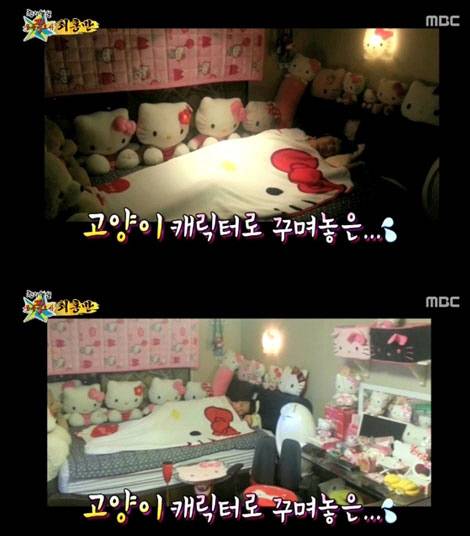이어 공개된 최홍만의 침실은 쿠션, 방석, 이불 등 전체가 헬로 키티로 도배가 되어 있어 모두를 깜짝 놀라게 했다.