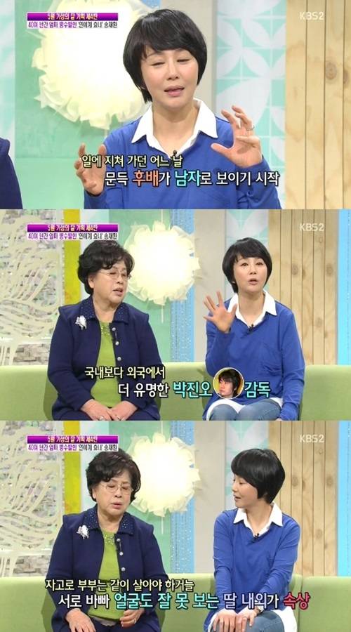 이어 송채환은 "남편과는 8년 동안 만났다. 대학교 후배였다. 하지만 8년 동안 뜨겁게 연애를 한 것은 아니다. 그냥 후배로 알고 지냈는데 내가 일에 지치고 힘들 때 갑자기 남자로 보이기 시작했고 결혼까지 하게됐다"라고 고백했다.