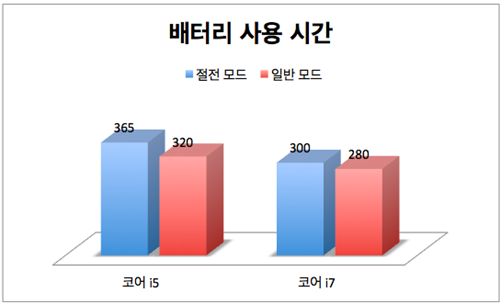 ▲ 배터리 사용 시간은 CPU 성능이 낮은 코어 i5 제품이 앞선다. 물론 배터리 용량과 사용 환경에 따라 다르므로 참고용으로 보자.
